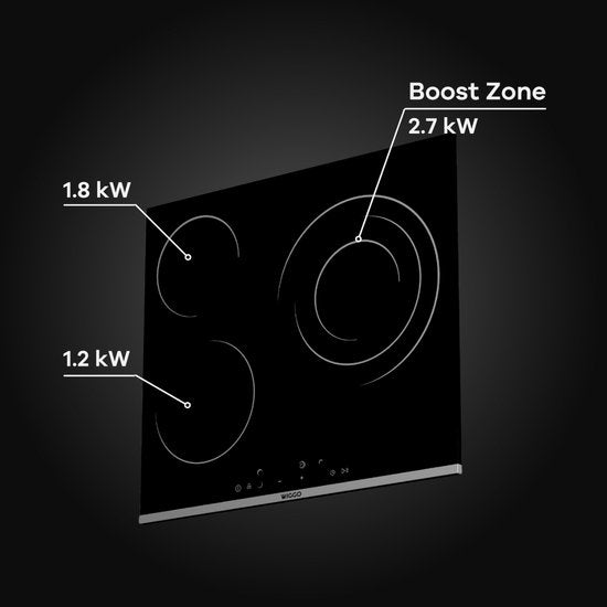 Met drie krachtige kookzones, waaronder een grote 2,7 kW zone, heb je volledige flexibiliteit voor zowel snelle bereidingen als grotere pannen. De dubbele verhittingsfunctie zorgt voor snellere en gelijkmatige warmteverdeling, terwijl de snelle opwarmfunctie tijd en energie bespaart.